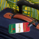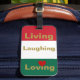 Inspiradora etiqueta de "Vivir, reír y amar" en oro para el equipaje. El texto dorado puede ser cambiado por el cliente y se elimina el fondo rayado. Por celeste@khoncepts.com