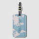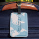 Una moderna etiqueta azul claro para identificar tus maletas... tu nombre en un estilo de letra serif, profesión y mapa blanco del mundo...