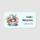 Etiqueta de nombre con una adorable imagen de verano. Un diseño acuático con un panda blanco y negro sentado en una junta de natación en el agua. Rodeado de flores silvestres de bonito. Un oso totalmente frío.