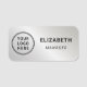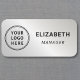 Etiqueta de nombre profesional con el logotipo de su empresa u organización en un fondo metálico falso plateado. Agregue un nombre y un título o una posición en una tipografía simple.