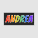 Esta diversión, características del diseño conocidas vibrantes, multicoloras de la etiqueta el nombre común "ANDREA", con las letras del nombre que tiene un espectro colorido del arco iris tiene gusto del modelo del colorante de la pendiente, en un fondo coloreado negro. Un nametag como esto se pudo llevar por un miembro del personal, un empleado, o un representante/delegado de servicio de atención al cliente que se nombra Andrea, para ayudar a identificar al portador a otros. [~Z0000344]