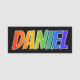 Esta diversión, características del diseño conocidas vibrantes, multicoloras de la etiqueta el nombre común "DANIEL", con las letras del nombre que tiene un espectro colorido del arco iris tiene gusto del modelo del colorante de la pendiente, en un fondo coloreado negro. Un nametag como esto se pudo llevar por un voluntario, un empleado o un representante/delegado de servicio de atención al cliente nombrados Daniel, para ayudar a identificar al portador a los clientes o a la otra gente. [~Z0000344]