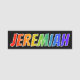 Esta diversión, características del diseño conocidas vibrantes, multicoloras de la etiqueta el nombre común "JEREMIAH", con las letras del nombre que tiene un espectro colorido del arco iris tiene gusto del modelo del colorante de la pendiente, en un fondo coloreado negro. Un nametag como esto se pudo llevar por un voluntario, un empleado, o un miembro del personal cuyo nombre es Jeremiah, para ayudar a identificar al portador a los clientes o a la otra gente. [~Z0000344]