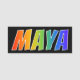 Esta diversión, características del diseño conocidas vibrantes, multicoloras de la etiqueta el nombre común "MAYA", con las letras del nombre que tiene un espectro colorido del arco iris tiene gusto del modelo del colorante de la pendiente, en un fondo coloreado negro. Un nametag como esto se pudo llevar por un representante/delegado de servicio de atención al cliente, un voluntario, o un empleado nombrado maya, para ayudar a identificar al portador a otros. [~Z0000344]