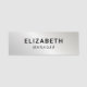 Simple etiqueta de nombre moderno con un nombre y título en un fondo metálico falso plateado.
