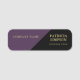 Esta etiqueta de nombre distintiva presenta un diseño dividido en diagonal, combinando bloques de color negro y violeta de Acai de una manera única. Los tipos de letra dorados utilizados para el Nombre y el Título añaden un toque de elegancia y sofisticación. La sección negra proporciona un fondo limpio y moderno para la información del empleado, mientras que la sección Violet Purple de Acai agrega un toque de color y singularidad. La combinación de colores y fuentes crea un equilibrio armonioso que hace que este diseño resalte. Este diseño es perfecto para los profesionales que quieren hacer una declaración con su etiqueta de nombre.
