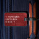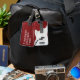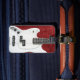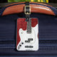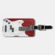 Etiqueta de equipaje de guitarra blanca con plantilla de texto en un lado. Diseño gráfico rojo oscuro en ambos lados. La imagen parcial de una guitarra blanca y eléctrica está en el frente con texto en negrita y blanco en la parte posterior. Identifique su equipaje fácilmente con una etiqueta única.