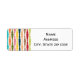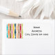 Estas etiquetas de dirección de retorno tienen un diseño moderno de mediados de siglo de líneas verticales de rectángulos redondeados de tamaño creciente y decreciente en colores retro de rojo, verde, azul, amarillo, naranja y marrón en un campo de blanco.