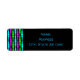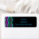 Estas etiquetas de dirección de retorno tienen un diseño moderno de mediados de siglo de rectángulos redondeados de neón rosa, verde y azul en un tamaño creciente y decreciente que corre verticalmente sobre un campo de negro.