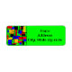 Estas etiquetas de dirección devueltas tienen un diseño Bauhaus de rectángulos y cuadrados con líneas negras que atraviesan el diseño en un campo de verde.