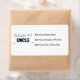 Futuras cajas de sake Uncle keepsake, azulejos, ornamentos, cuadernos, tazas, imanes, tarjetas, botones, cascos, cadenas de claves, y otras prendas de vestir y artículos de regalo de futuros tíos con un texto azul y negro y diseño de estrellas.