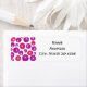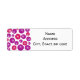 Estas etiquetas de dirección de devolución tienen un diseño moderno de mediados de siglo con círculos de color morado y rosa con explosiones de estrellas blancas en ellos, todo sobre un fondo blanco.