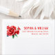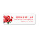 This return address label features a minimalist design with three vibrant red roses and green leaves on the left, creating a striking contrast against the clean white background. The text is arranged in a vertical hierarchy using bold, uppercase sans-serif fonts in matching red hues, providing a modern and elegant look. Perfect for adding a touch of sophistication to your mail, this label combines simplicity with romance, making it ideal for personal correspondence or special occasions.