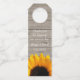 Percha de botellas con temática de boda de moda rústica hecha con un aspecto de madera templada, con un gran girasol amarillo en la parte inferior. Personalice el texto en blanco para leer lo que desee. Ofrece a sus huéspedes bodas excelentes etiquetas con las botellas de vino.