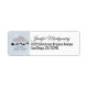 Los Navidades festivos devuelven las etiquetas de dirección. Un sutil fondo gris con copos de nieve. Fancy trendy lettering, que dice: Feliz Navidad y Feliz Año Nuevo. Con una silueta negra, Santa montando en su trineo siendo jalado por su reno volando por el cielo.