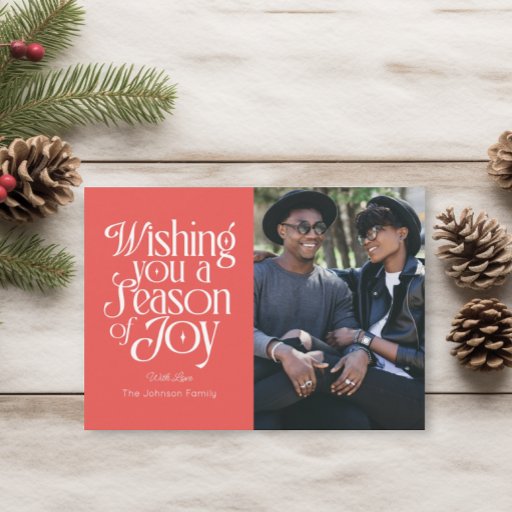 Share your holiday cheer with this bold and modern Season of Joy label. Featuring stylish typography, this customizable Christmas card label is perfect for sending festive wishes to loved ones. Personalize with your family name or even change the background color to match your style. Ideal for modern families, couples, or holiday party invites.
