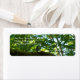 Fotografía de un robo encaramado en una rama de árbol cubierta de musgo en un bosque. El pájaro tiene que volver a la cámara y está mirando bien. Árboles jóvenes en el fondo llevan hojas de verano, y el cielo azul se ve en las pocas aberturas entre hojas y ramas. Derechos reservados ©2021 Kimberly J Tilley.