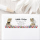 Etiqueta de la dirección de retorno de los bodas con temática de dinosaurio divertida. Novia de dinosaurios y novio en un hermoso prado de flores silvestres prehistórico, una gran manera de traer diversión y alegría a su día de bodas. Caligrafía moderna de tipografía caprichosa con plantillas fáciles de personalizar. Novedoso y único novio Tyrannosaurus Rex con flores silvestres acuarelas obra de arte original de la artista Catherine Sweetman Ideal para el día de la boda o para la cena de ensayo. La suite boda incluye todo lo que necesita en su viaje boda divertido