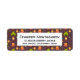 Devolver etiquetas de dirección con un divertido patrón temático de camping. Sobre un fondo marrón rojizo. Los elementos en el patrón incluyen una fogata, una tienda, una guitarra, una pala y una mochila. Un rectángulo blanco sobre la parte superior con tu información personalizada dentro.