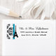 AGREGUE TU NOMBRE A ESTA MODA Y BONITO, ETIQUETAS DE RETORNO TEMÁTICAS PARISIANAS Y FRANCESAS CON UNA TORRE EIFFEL SOBRE UN ELEGANTE FONDO FLORAL NEGRO Y BLANCO DE DAMASK Y UN DISEÑO IMPRESO DE RIBÓN EN UNA LUMINOSA COPA AZUL TURQUESA. DISEÑADO POR CHRISSY H. STUDIOS, LLC. TODOS LOS DERECHOS RESERVADOS.