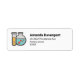 Etiquetas de dirección con un ilustracion lindo de un tubo de ensayo que contiene líquido amarillo y un matraz/vaso de precipitado redondeado que contiene líquido verde con burbujas rojas.