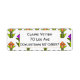 Estas etiquetas de dirección de retorno tienen un diseño art deco hecho de diamantes, triángulos y polígonos haciendo tulipanes en naranja y morado con tallos y hojas verdes.
