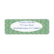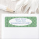 Estas etiquetas de dirección devueltas tienen un diseño art deco de círculos azules y púrpura que se conectan con líneas en un campo de verde claro.
