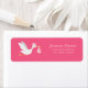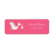 Una tierna y caprichosa invitación a una ducha de bebé con un fondo rosado, con una adorable cigüeña que lleva a una niña.