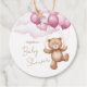 Etiquetas Baby Shower Favor decoradas con un adorable oso de peluche montando globos en las nubes.