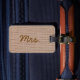 En las etiquetas de las maletas del personalizado se ha impreso un cuadro artístico de tela de color beige y marrón. Hay marcadores de posición para el Sr. o la Sra., y para información de contacto en la parte posterior.