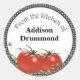 Esta etiqueta de conservas de tomate contiene tomates rodeados de viñas con bordes de tablero de ajedrez y un lugar para personalizar un nombre de la cocina de.