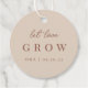 Las elegantes etiquetas de favores basadas en tipografía muestran "deja crecer el amor" en escritura con letras escritas a mano y letras serif clásicas. Perfecto para plantas, semillas o suculentos favores para bodas o duchas de novias. Color: Arroz, terracota de color tierra cálida sobre un fondo beige de arena.