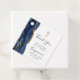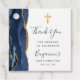 Esta etiqueta de agradecimiento de confirmación incluye un diseño de agate color azul marino adornado con un falso purpurina de oro. Una cruz de Relieve metalizado falsa de oro aparece encima de las palabras "Gracias" en escritura a mano gris carbón sobre fondo blanco. Personalízalo con el nombre del invitado de honor, la ocasión y la fecha en letra de copperplate gris de carbón.