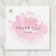 Un bellamente simple y elegante etiqueta de agradecimiento perfecta para favores de boda o cualquier otro evento. Este diseño moderno y limpio presenta un delicado rosa de acuarela rosa-bebé en el fondo, con "Gracias" y fecha en letra de serif negra. Lo inverso es en rosa sólido con tu mensaje personal en blanco.
