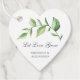 Etiquetas rústicas para la boda con un diseño sencillo con una acuarela verde pintada con hojas grandes, sobre un fondo blanco. Debajo está el mensaje, "Let Love Grow" (Dejen crecer el amor) en un tipo de letra de guión y sus nombres en un tipo de letra serif. El lavabo es de color verde. Estas elegantes etiquetas botánicas son perfectas para un boda de verano y le dan un toque personal a sus favoritos.