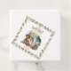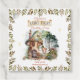 Un pequeño y dulce hada de bosque se alza fuera de su casa de setas entre las setas, el bosque y los animales de la selva de bosque mientras los frondosos arbustos se visten con elegancia a ambos lados de ella en este diseño compuesto de chicas de primer cumpleaños "Fairy First", diseñado por Holiday Hearts Designs.