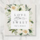 Nuestra colección de bodas florales con acuarela marfileña en flor de color marfileña presenta una vegetación acuática delicadamente pintada, follaje eucalipto, follaje botánico verde y flores de peonía blanca y marfil. Personalice estas etiquetas de favores personalizados con sus iniciales y fecha boda, debajo de "El amor es dulce" en letras clásicas con un acento decorativo de escritura.
