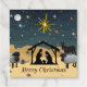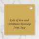 Esta etiqueta de regalo muestra un hermoso arreglo de la historia bíblica del nacimiento de Jesús incluyendo la Estrella sobre el establo. El cielo nocturno es un azul profundo cubierto de estrellas que contrasta con un terreno dorado que da una estética de oro azul. Se ha proporcionado texto opcional de "Feliz Navidad" y una plantilla para añadir el nombre de tu mensaje y/o cualquier otro texto al revés.