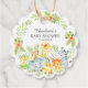 Animales de la jungla, etiqueta de favores para bebé con elefante, jirafa, mono, león y cebra enmarcados con hojas de la jungla y flores de hibisco.