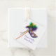 Juego de 12 etiquetas de favor cuadradas con una imagen de una hermosa máscara de satén morado, verde y dorado sobre un palo con plumas y cintas coordinadoras de color, y la frase "¡Laissez Les Bon Temps Rouler!" (Dejen que se jueguen los buenos tiempos) en escritura francesa violeta en blanco. La parte posterior es blanca con texto de personalizable. Vea la bolsa de favoritas, pegatina redondo y pegatina vinílico de corte personalizado. Ver toda la colección Mardi Gras Favor & Gift Tag en los TOUCHES ESPECIALES | Sección de favoritos de partido.