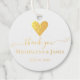 Sencillas y elegantes etiquetas de "gracias" con un corazón, nombres y la fecha boda.