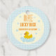 ¡Un pato afortunado! Primer cumpleaños con un pato de caucho y burbujas contra un gingham azul claro y fondo amarillo pálido con texto naranja