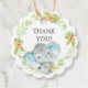 Animales de la jungla, etiqueta de favor para la ducha de bebé, con un elefante enmarcado con hojas de selva y flores de hibisco.