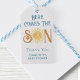 La etiqueta de regalo de la ducha de bebé de este lindo niño muestra el texto "Here Comes The Son" en una tipografía retro azul con un sol de color amarillo sonriente. Personalizable fácil. Acuarela original © Michele Davies.