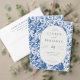 Celebrate your union with elegance and serenity through our “Azure Blooms” collection—where vibrant blue toile patterns meet refined design to bring your wedding vision to life. This collection features an elegant style with a cohesive blue toile floral theme, perfect for weddings. The artwork is characterized by intricate botanical designs in varying shades of blue and white, creating a sophisticated and timeless look. Recurring motifs include lush flowers and foliage, which adorn various items such as invitations, tableware, wine labels, menus, and thank you cards. These elements are meticulously arranged to evoke a sense of romance and refinement. The versatility of the design allows it to be applied across multiple product types, ensuring a harmonious aesthetic throughout the wedding celebration.