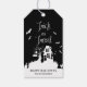 Un truco de personalizable de Halloween o etiqueta de regalo de regalo con una casa embrujada con gatos, murciélagos, lápidas y búhos y rayas blancas y negras para el respaldo. Esta etiqueta de regalo es perfecta para favores de fiesta.