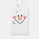 Un lindo feliz hombre de nieve enfrenta etiquetas de regalo para las vacaciones