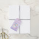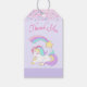 Una etiqueta de regalo de agradecimiento con el ilustracion de un lindo unicornio kawaii durmiendo tranquilamente con una elegante melena y cola de rizo. Una colorida estrella de tiro arco iris sobre su cabeza. Confeti rosado salpicado por la parte superior. La imagen no es realmente confetti. El borde inferior tiene un fondo de puntos polka blanco y púrpura. Adorable diseño ondulado.