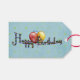 Conjunto de 10 etiquetas de regalo rectangulares con una imagen de un globo rojo, azul y amarillo y "Feliz Cumpleaños", que se deletrea en una colorida mezcla de letras sobre un fondo azul con sutiles puntos de polka verde. La parte de atrás tiene una imagen azul con sutiles puntos verdes de polka. Vea la caja de favoritas correspondiente, pegatina oval y pegatina vinílico de corte personalizado. Ver la colección completa de Favor y Etiqueta de Regalo de Cumpleaños en los TOUCHES ESPECIALES | Sección de favoritos de partido.