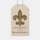 Elegantes etiquetas de regalo de oro fleur de lis con el nombre de su familia y el texto personalizado. La parte trasera tiene un patrón de flor de lis.